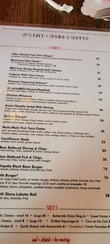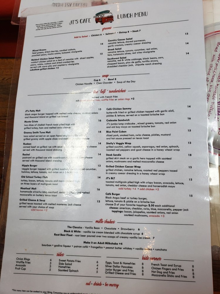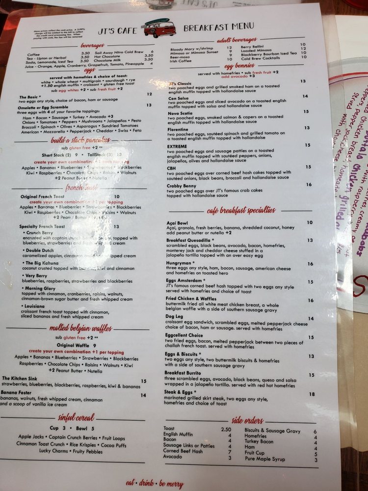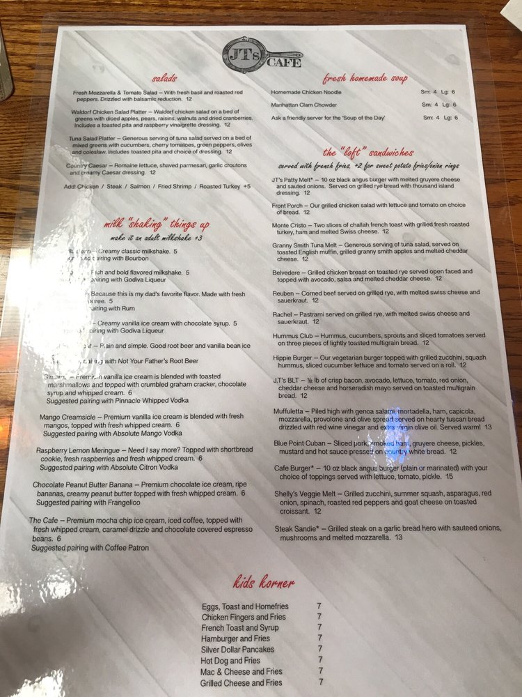 Welcome to JT's Cafe, where you can indulge in a mix of delectable dishes in the categories of Burgers, Breakfast & Brunch, and Comfort Food. Located at 4 Montauk Hwy Blue Point, NY 11715, this restaurant offers a range of utilities such as reservations, delivery, takeout, wheelchair accessibility, catering, and more.
